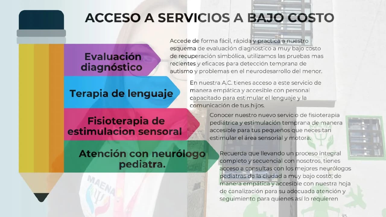 También ofrecemos servicios de aplicación de pruebas diagnósticas a bajo costo, con la colaboración de un neurólogo pediatra, para identificar problemáticas específicas en el desarrollo de los menores.